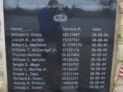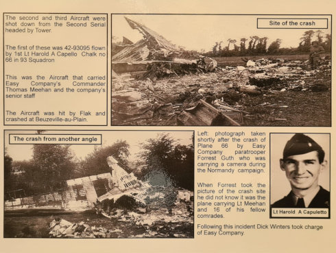 Following the crash and the death of Lieutenant Meehan, Easy Company's commander, the men of Easy Company served under Lieutenant Winters as depicted in the series Band of Brothers Episode 2: Day of Days. In this episode Easy Company are tasked with clearing 4 guns near Brecourt Manor, to the corner of this field there is now a memorial to the men of Easy Company including Lieutenant Meehan.