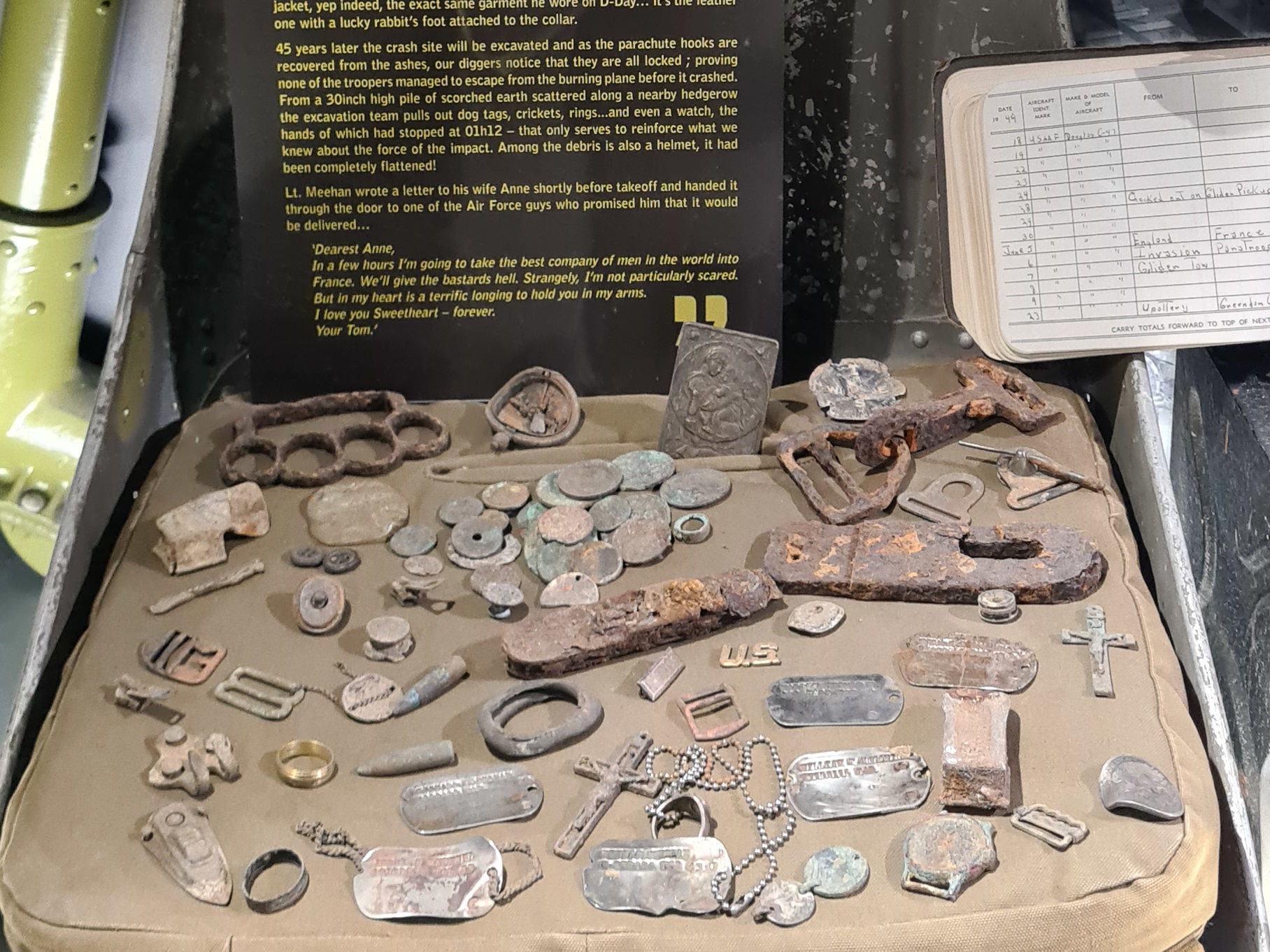 45 years after the crash the site was excavated, some of the artefacts from the excavation can now be seen on display at Dead Man’s Corner Museum including dog tags, rings and a watch which had stopped at the time of the crash, 01:12.
