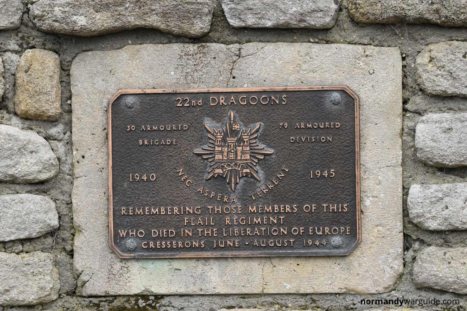 A memorial to the members of the 22nd Dragoons who died in the liberation of Europe, the regiment supported the liberation of Cresserons on the 7th June 1944 with their mine-clearing flail tanks