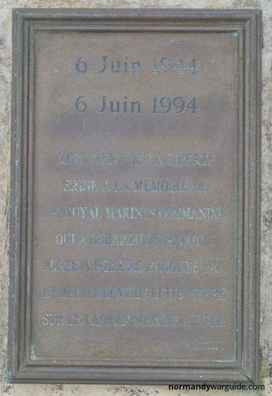 A memorial to the 41st Royal Marine Commando who liberated Lion-sur-Mer. The memorial is a large sundial with the time the marines landed on the beach marked by the location of a plaque on the dial.