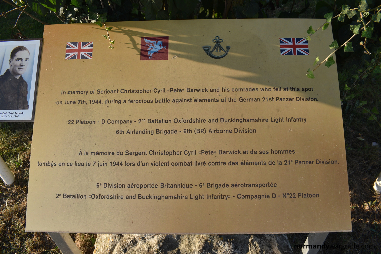This memorial marks the spot where Serjeant Christopher Cyril “Pete” Barwick and his comrades of 22 Platoon, D Company, 2nd Battalion Oxfordshire and Buckinghamshire Light Infantry, were killed on 7 June 1944.