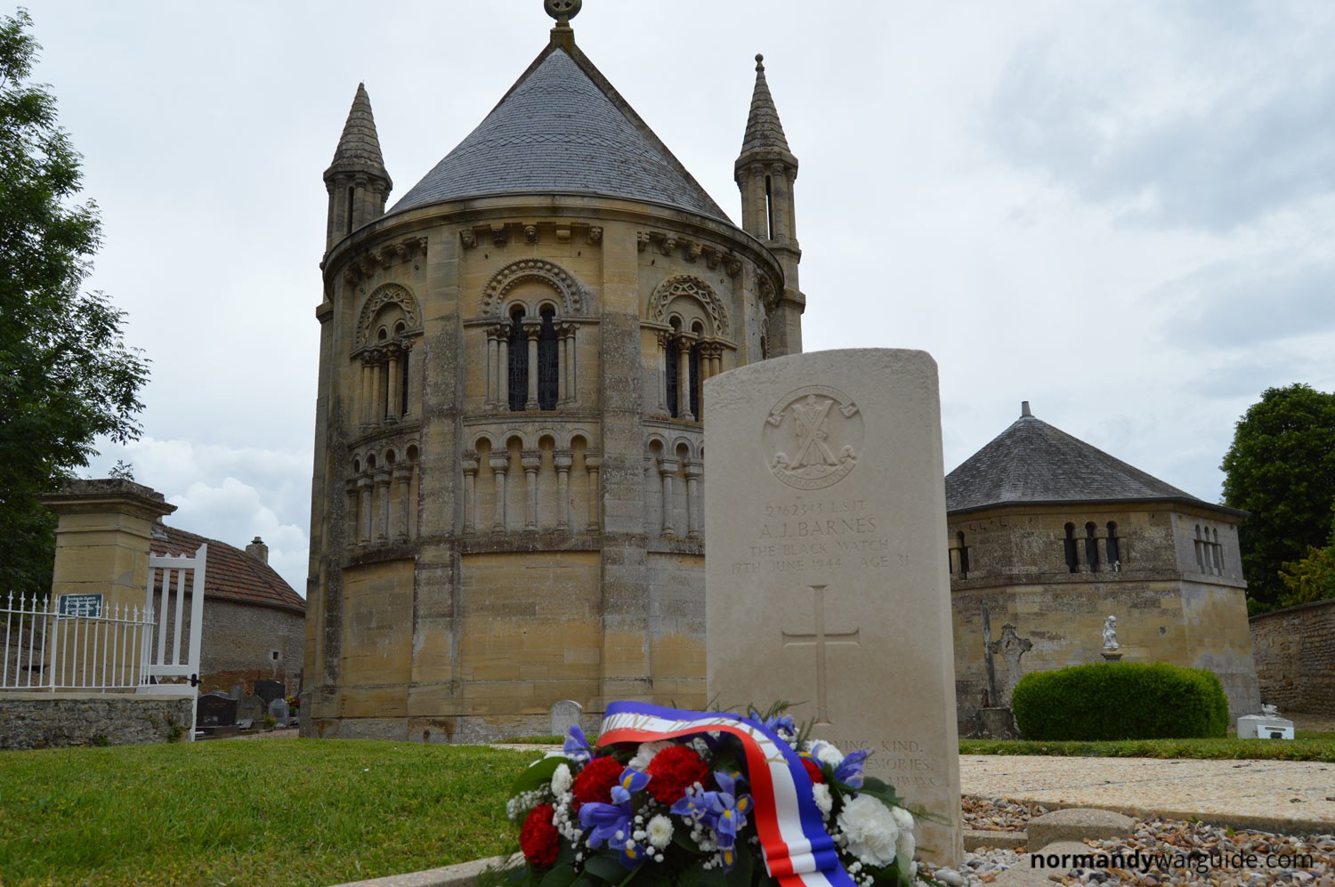 Basly Churchyard is 7km North West of Caen on the D79 between Caen and Courseulles. The churchyard contains 1 Commonwealth burial which belongs to Alfred James Barnes of Black Watch (Royal Highlanders)