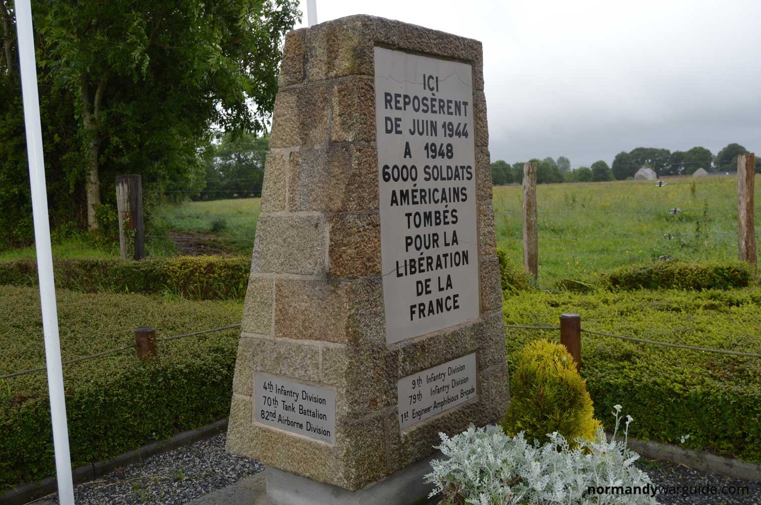 A plaque dedicated to Sgt Stanley Smith, William Walter, Robert Herrin and Robert Holtzmann soldiers of the 505 Parachute Infantry Regiment who were killed in action on this spot on the 6th June 1944.