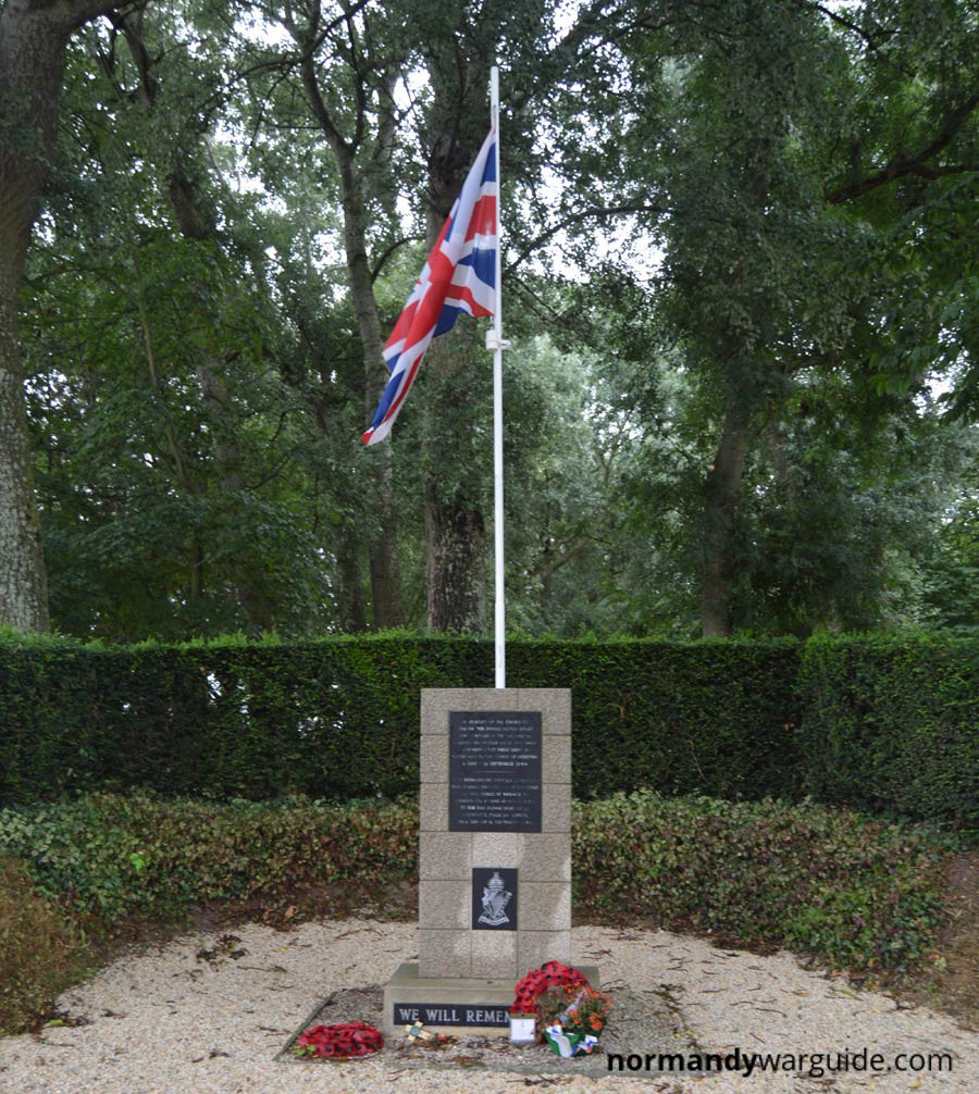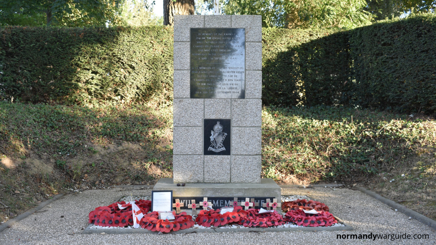 The memorial stands in front of the Cambes-en-Plaine Commonwealth War Cemetery, where 14 members of the 2nd Battalion Royal Ulster Rifles are buried.
