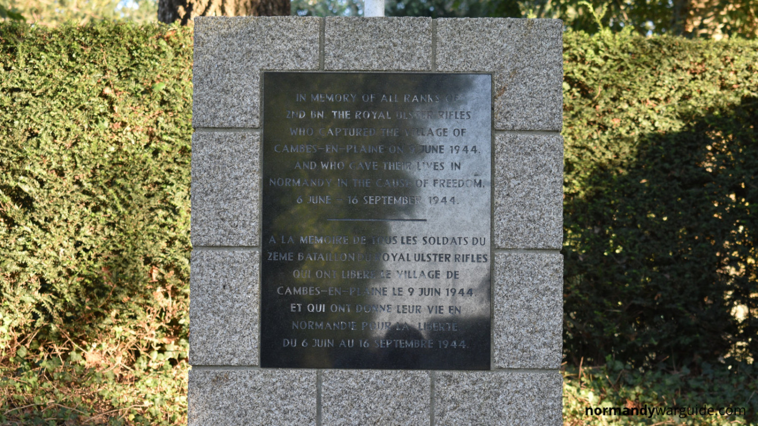 This memorial in Cambes-en-Plaine, Normandy commemorates the officers and men of the 2nd Battalion, Royal Ulster Rifles, who captured the village on 9 June 1944 during the Battle of Normandy. It also honours all ranks of the battalion who lost their lives in Normandy between 6 June and 16 September 1944.