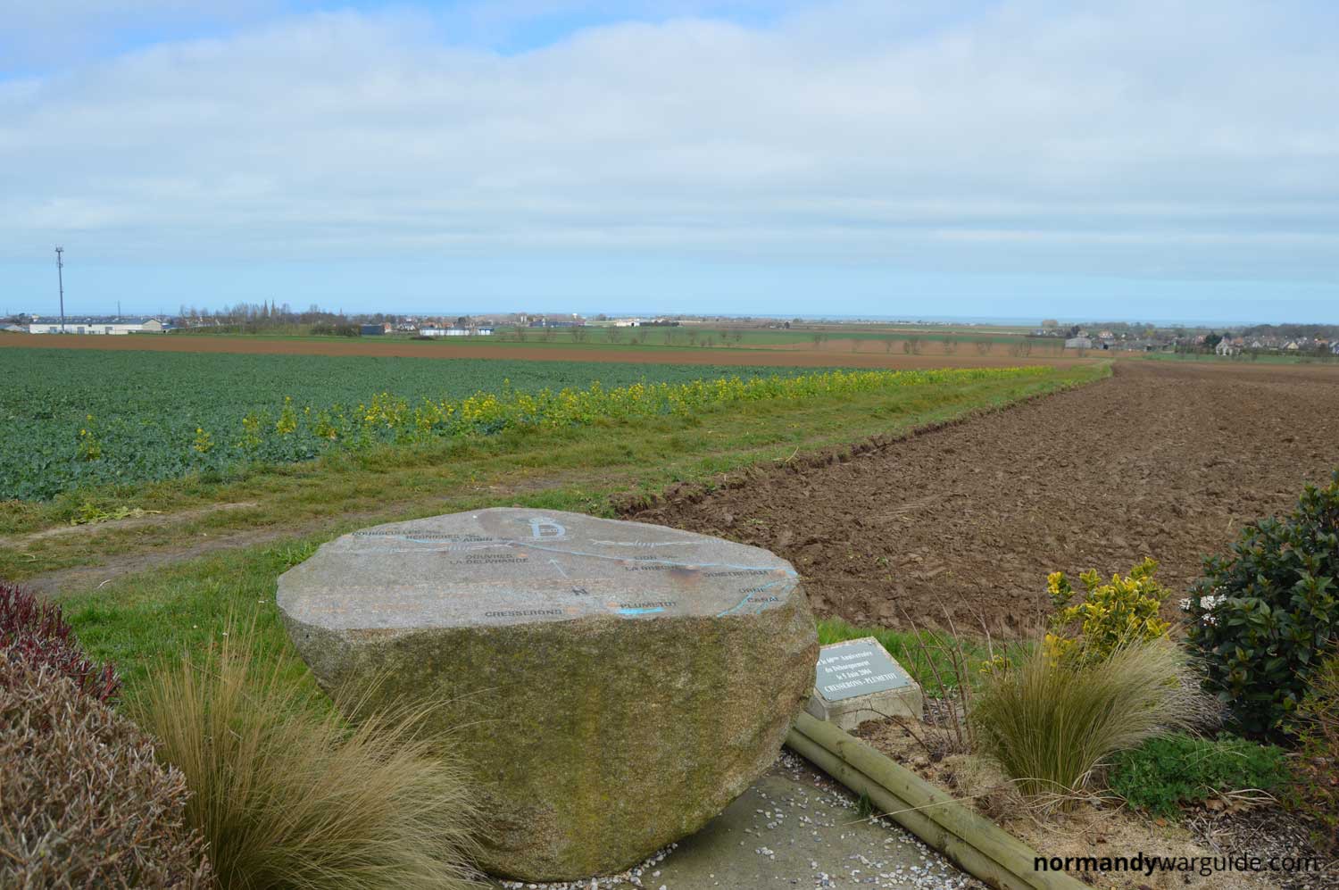 A memorial stone detailing a panoramic view over the slope down to sword beach. Located just outside the town of Cresserons the stone shows local landmarks.