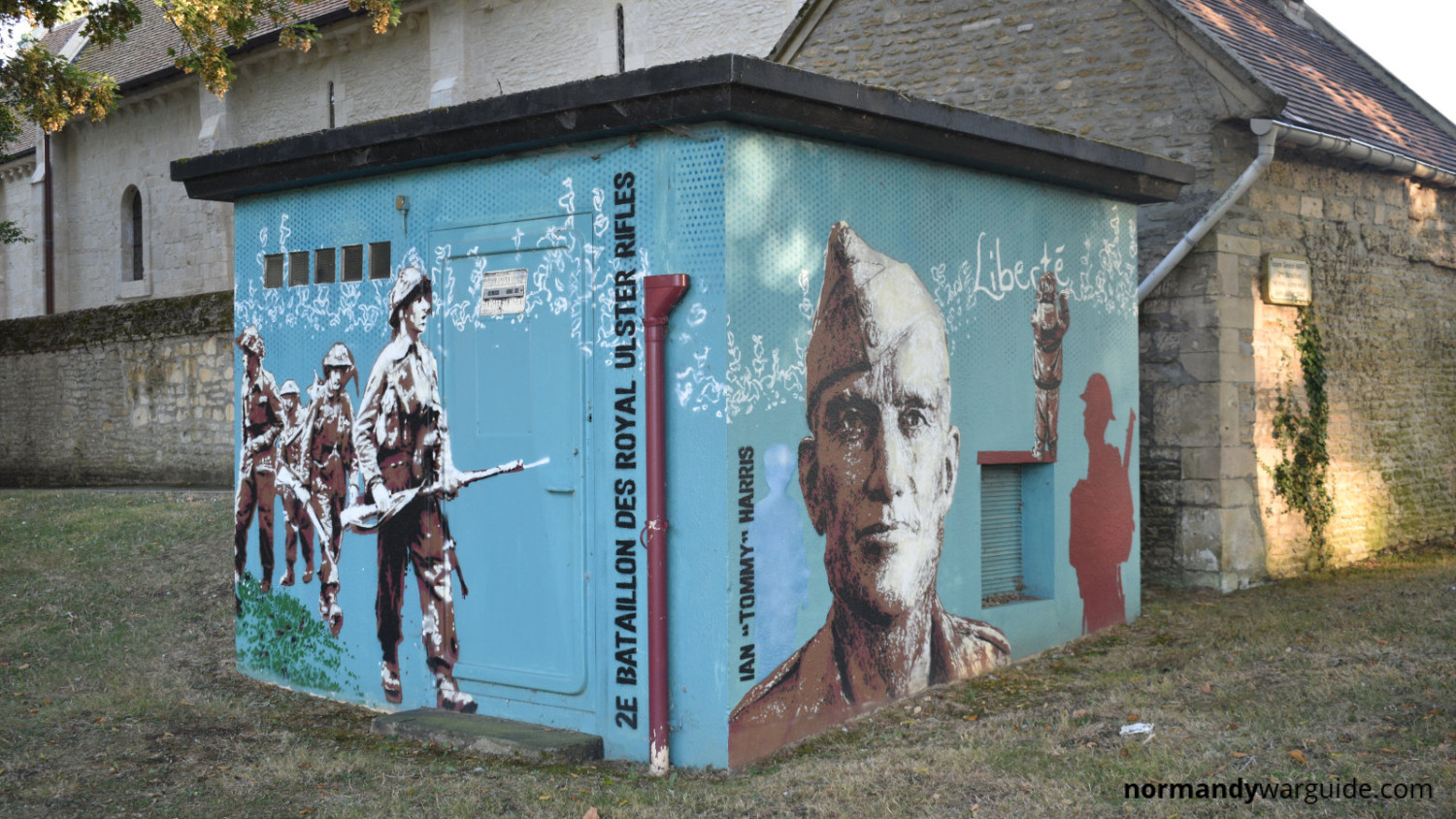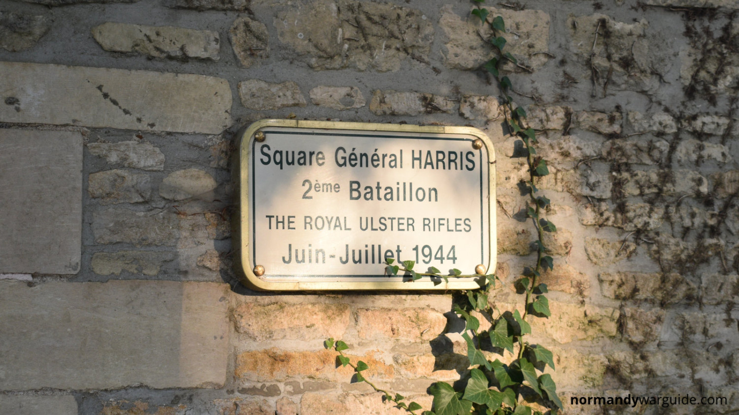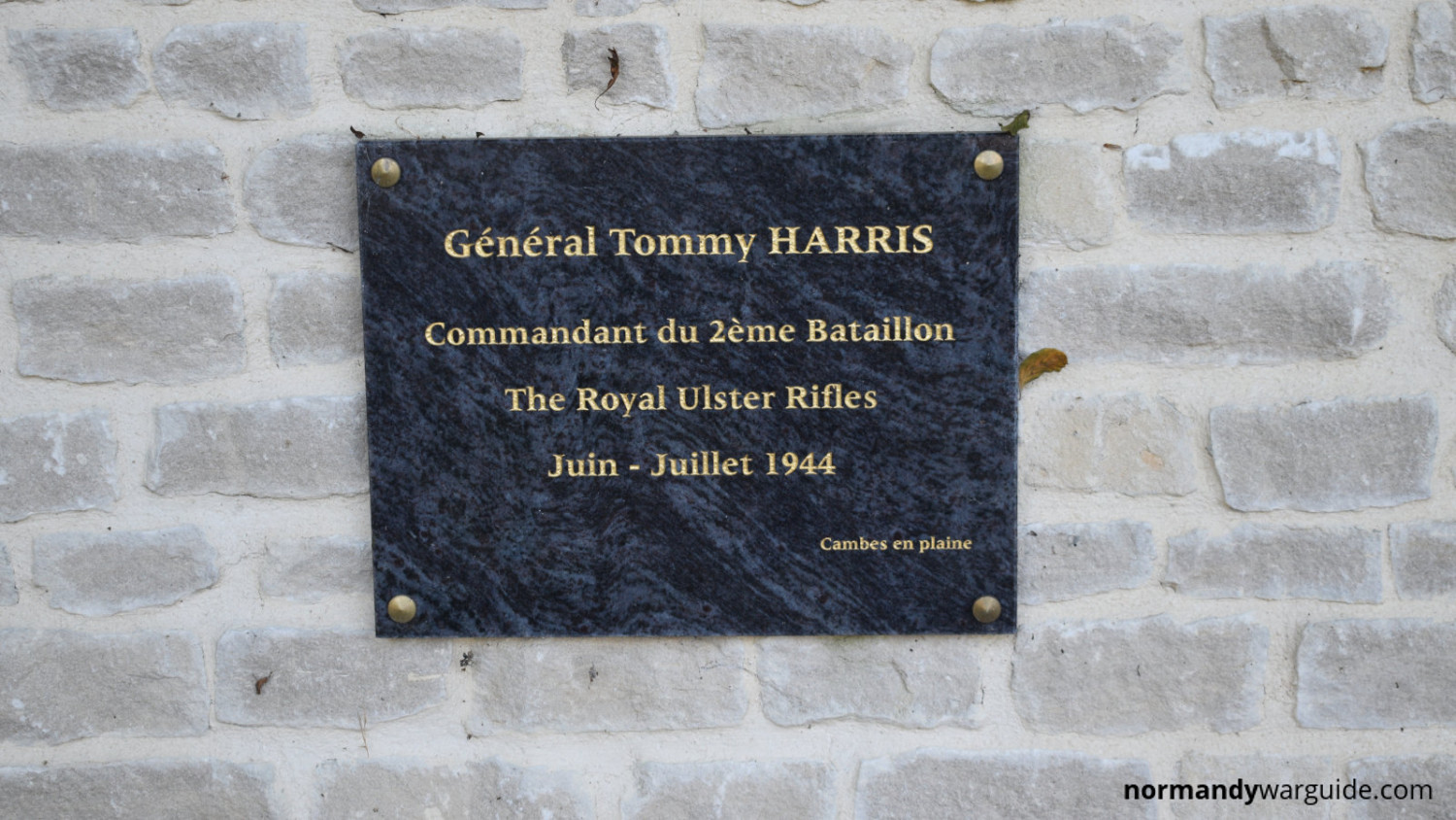 This memorial in Cambes-en-Plaine honours General Tommy Harris, who commanded the 2nd Battalion, Royal Ulster Rifles during June and July 1944. It is located at Square Général Harris, alongside a mosaic artwork dedicated to him and the men of the battalion who fought in the area during the Battle of Normandy.