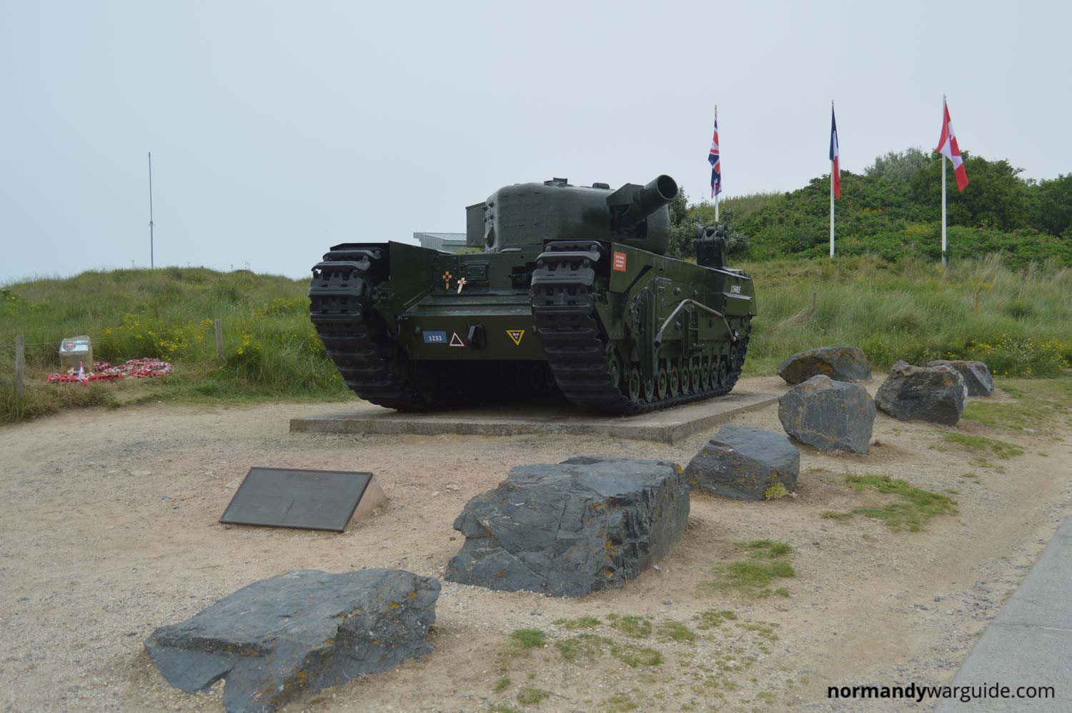 A Churchill A.V.R.E. tank that landed on the beach at Graye-sur-Mer and was stopped on its way inland when it was unable to bridge a deep culvert and foundered.