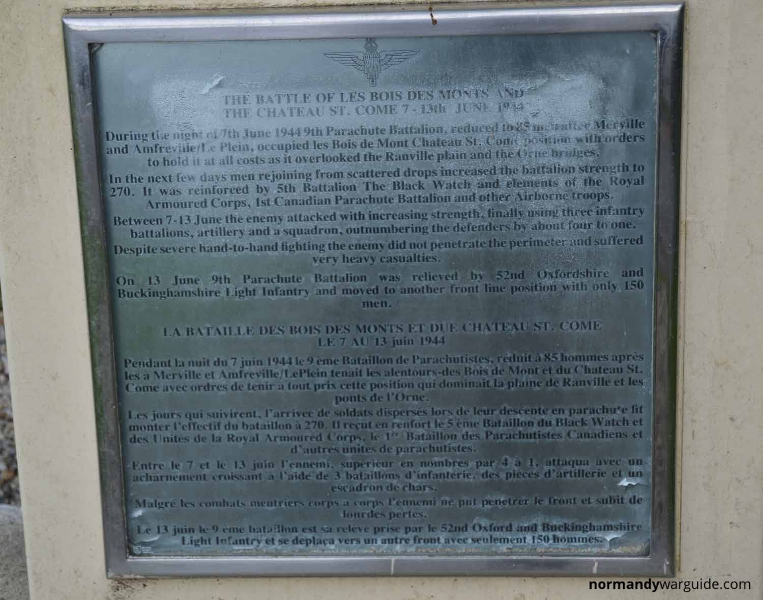 A plaque describing the Battle of Les Bois Des Monts and The Chateau St.Come.