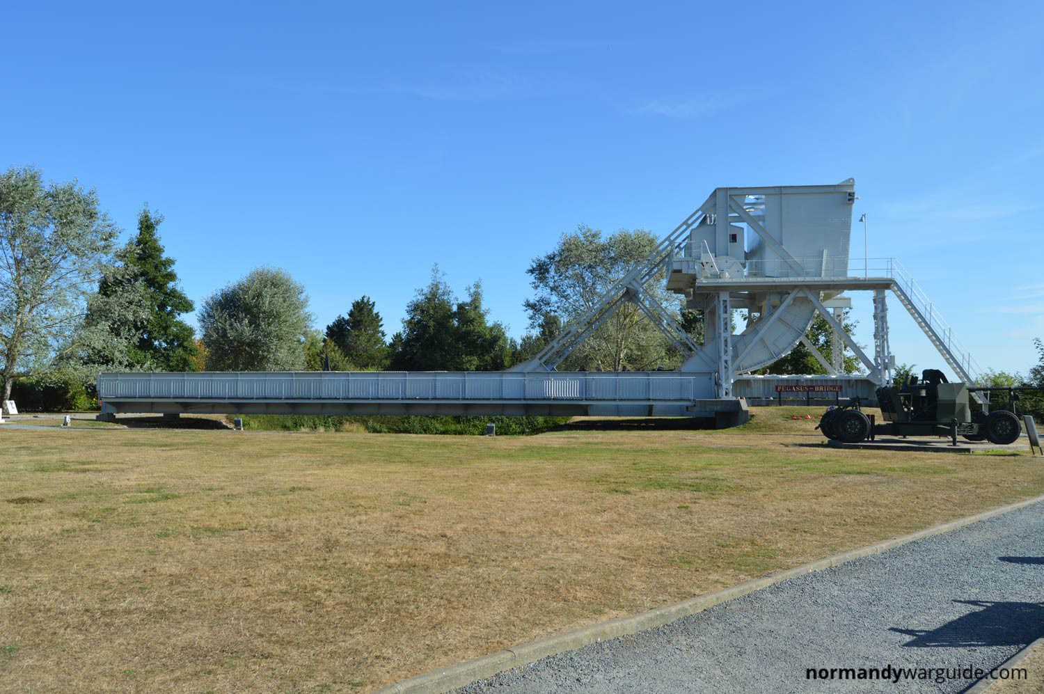 In 1994, the original Pegasus Bridge was replaced with a larger structure due to the widening of the canal, although the new bridge closely resembles the original. The original bridge is now preserved in the museum’s grounds, alongside a Bailey Bridge and a full-sized replica of a Horsa Glider, similar to those used in Operation Deadstick—the assault that secured the bridge.