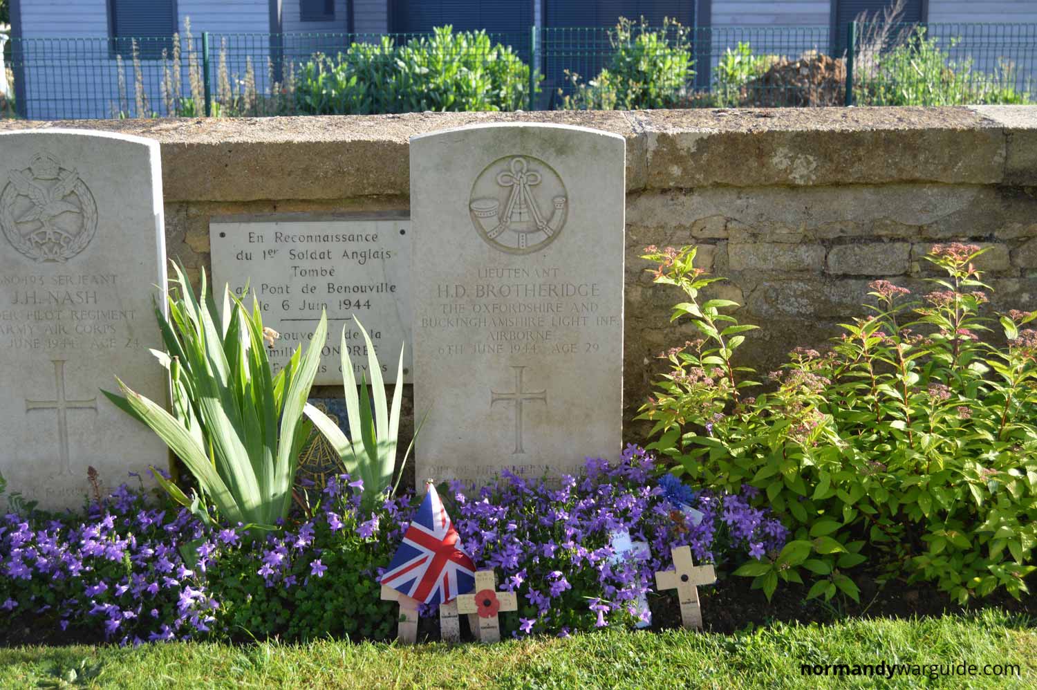 On the morning of the 6th June 1944 at 00:16 members of the 6th Airborne Division landed in 3 gliders taking the German defenders by surprise and capturing the bridge intact after a brief 15 minute skirmish. Lieutenant Herbert Denham Brotheridge was killed while storming the bridge after being shot in the neck by a German machine gun, he is considered to be the first Allied soldier killed in action on D-Day and is now buried in Ranville church yard.