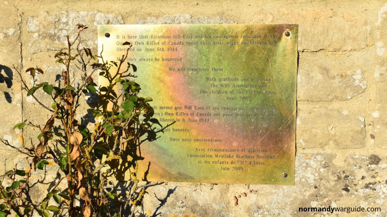 This plaque marks the location where Rifleman Bill Ross and his comrades of the Queen’s Own Rifles of Canada spent their first night on Norman soil after the liberation of Anguerny on 6 June 1944.