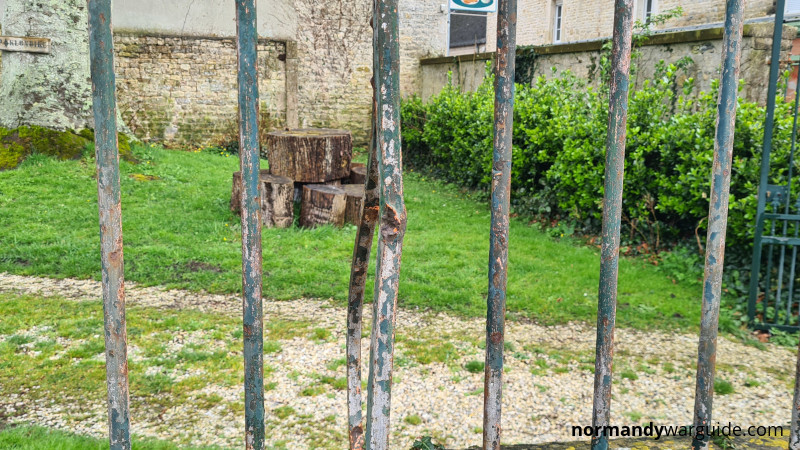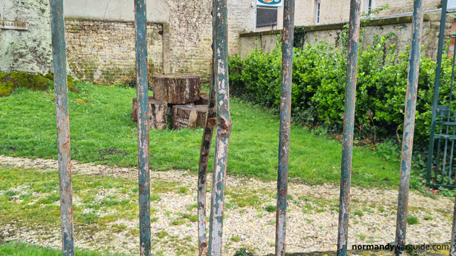 Some of the metal railings opposite the church still show visible bullet damage from the battle, providing a tangible reminder of the intense combat that occurred in this small Normandy town.