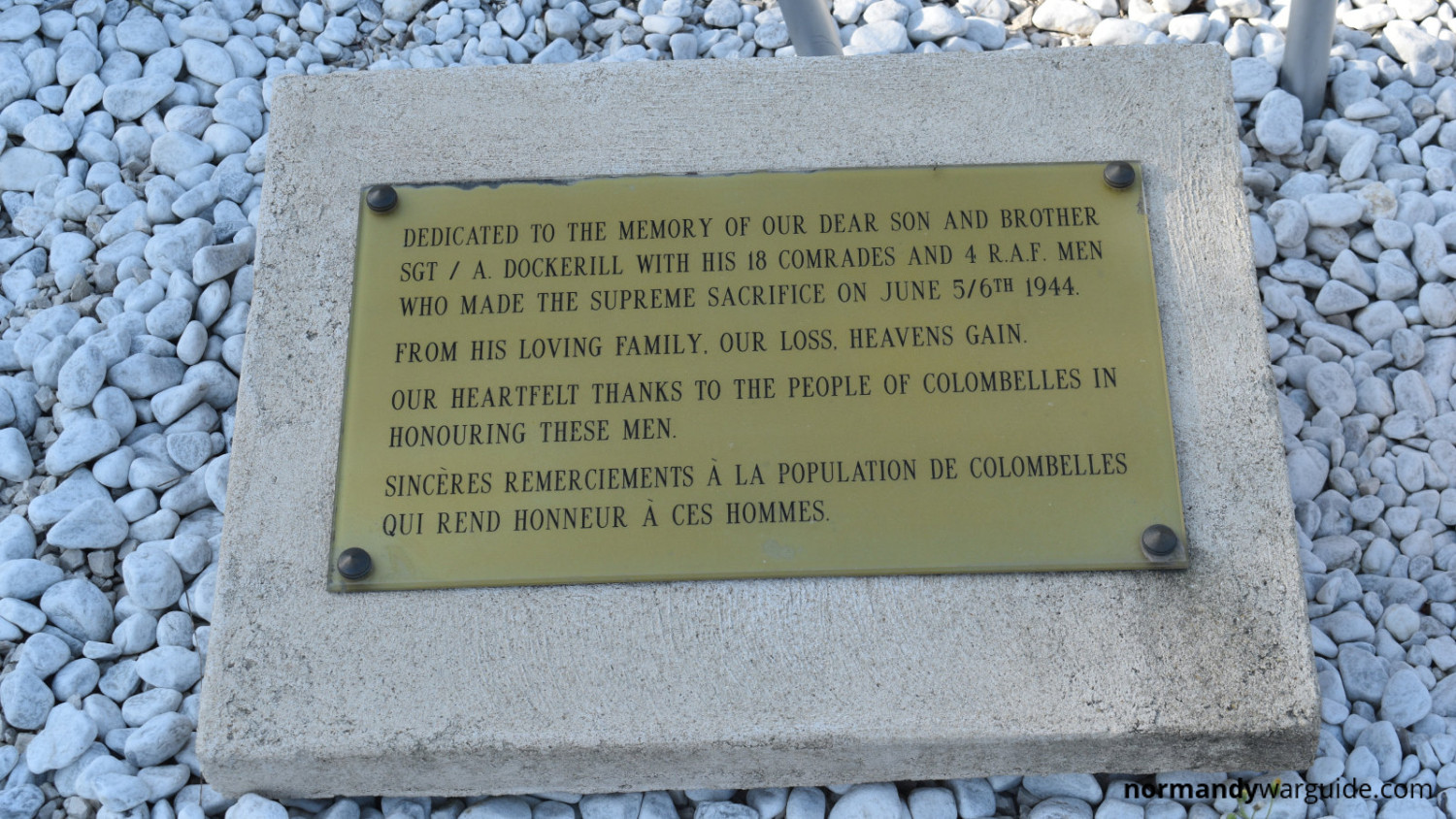 This memorial plaque is dedicated to Sergeant A. Dockerill, his 18 comrades, and four Royal Air Force personnel who were killed on the night of 5–6 June 1944 during operations in Colombelles, Normandy. The inscription, placed by Dockerill’s family, expresses gratitude to the people of Colombelles for honouring the men who lost their lives.