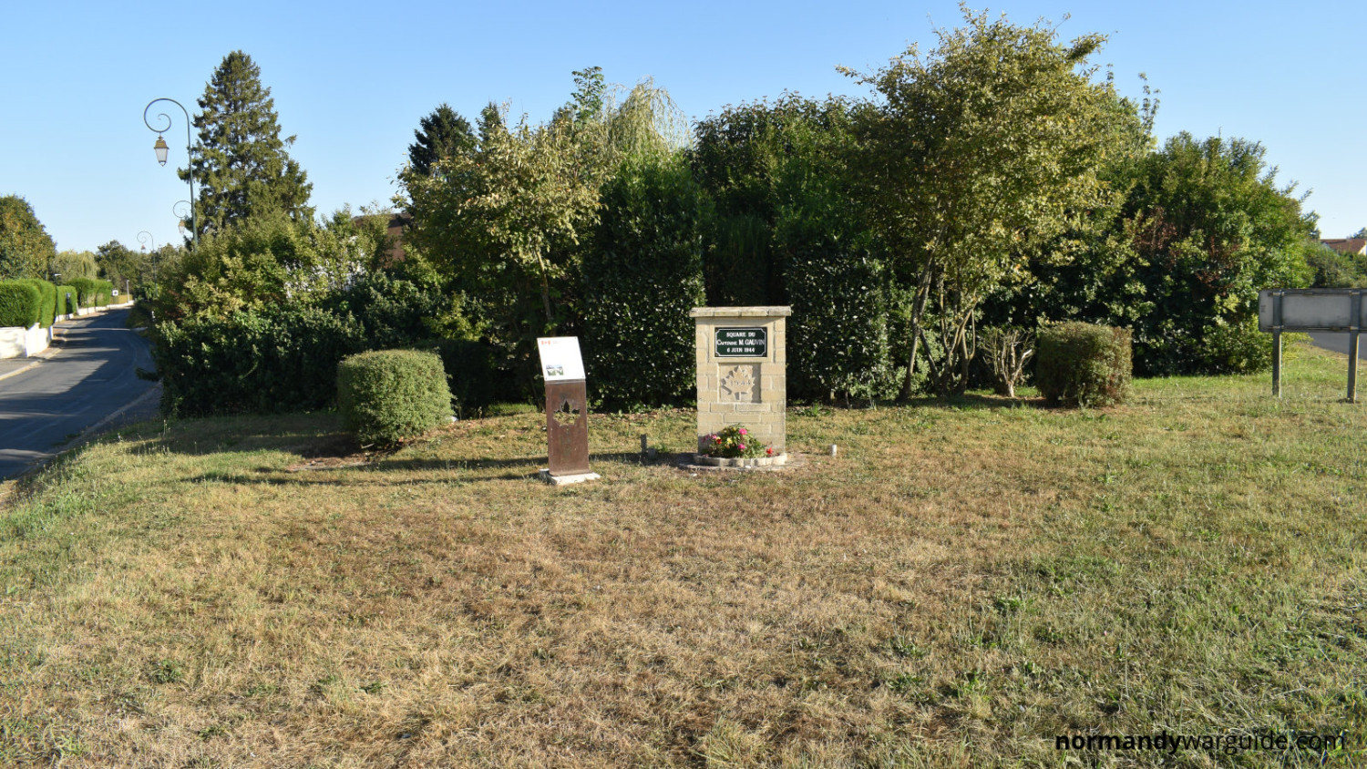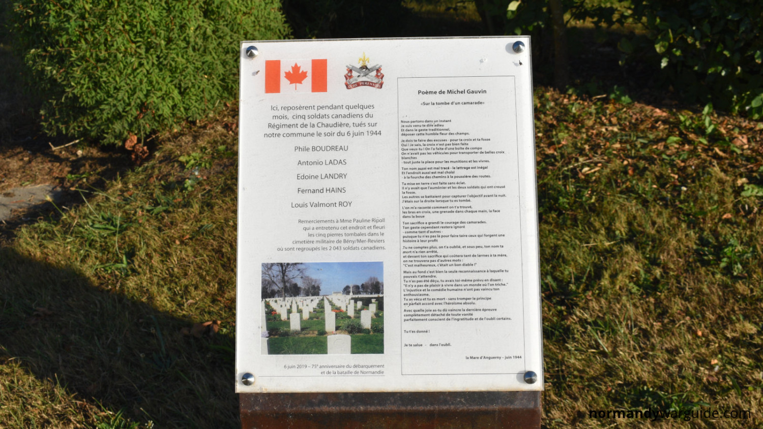 Memorial to Captain Michel Gauvin of Le Régiment de la Chaudière, commemorating his role in the D-Day landings and the liberation of Colomby-Anguerny.
