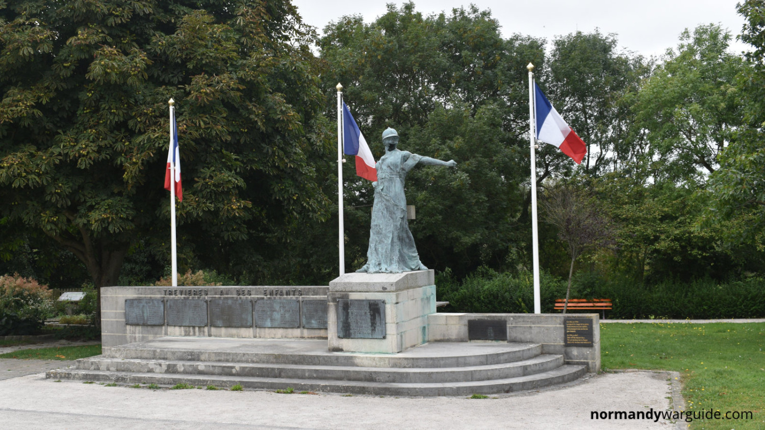 The World War I memorial in Trévières, a commune in the Calvados department of Normandy, France, stands as a tribute to the soldiers from the village who lost their lives during the First World War. Erected after the war, the monument features a striking statue of a woman representing France — a symbol of both grief and resilience.